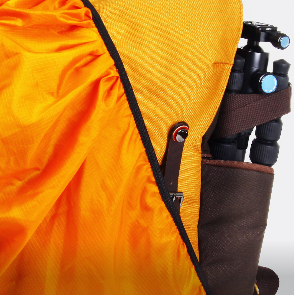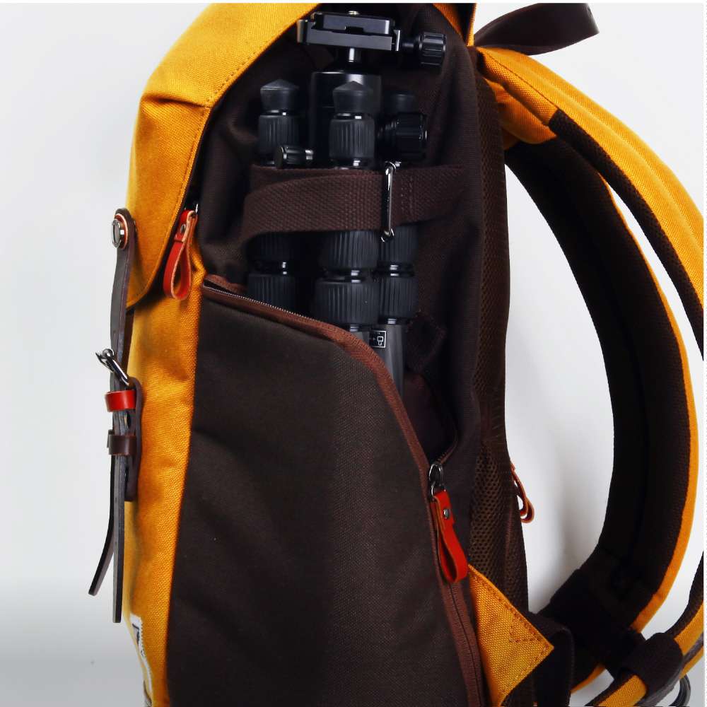 側面には三脚固定ベルトを配置。サイドポケットを使用して三脚を固定できます。