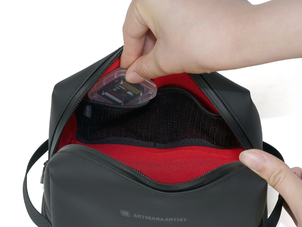 十分なクッション素材でカメラをしっかり保護します。背面(内側)には2口のメッシュポケットを備え、SDカードなどの小物を収納可能。前面にはネームホルダーを装備し、中身をスマートに管理可能。