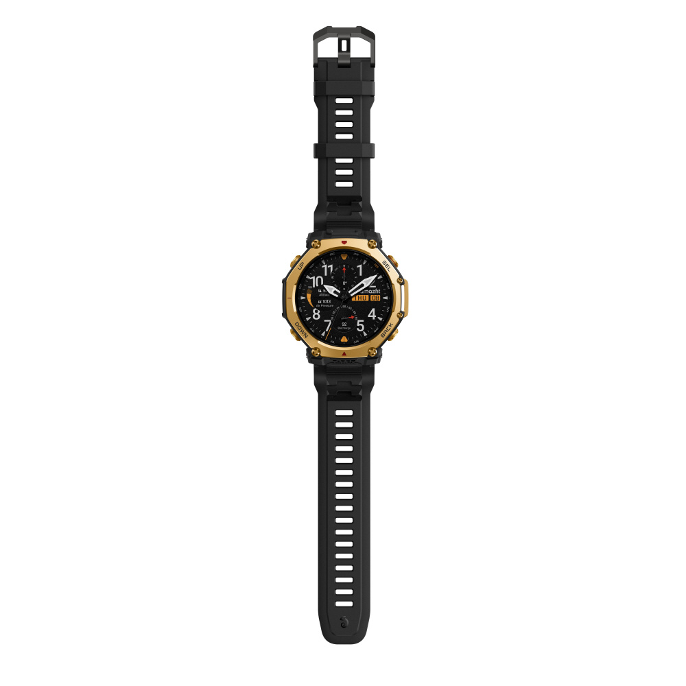極限環境に挑むためのギア、Amazfit T-Rex 3 Pro。チタン合金とサファイアガラスによる堅牢な構造に、軍用規格の耐久性を装備。強烈な日差しでも鮮明な3,000nitディスプレイ、デュアルバンドGPS、2色LED懐中電灯、そしてロングバッテリーで冒険を支える究極のアウトドアスマートウォッチ