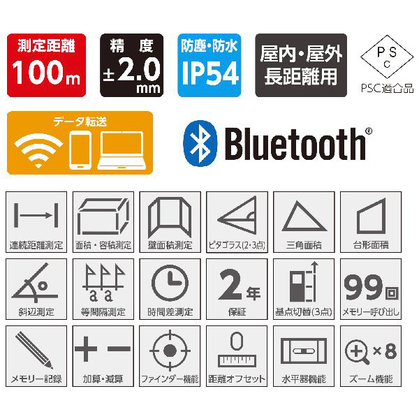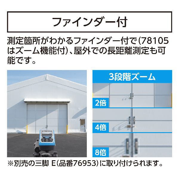 測定箇所が分かるファインダー付で、屋外での長距離測定も可能です。【データ転送で作業を効率化】