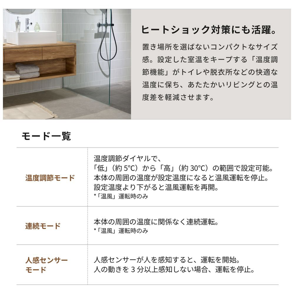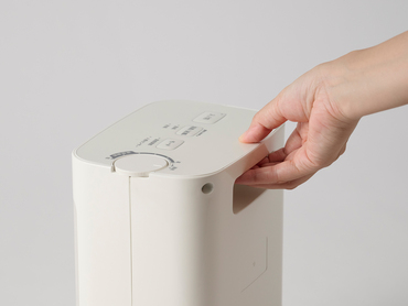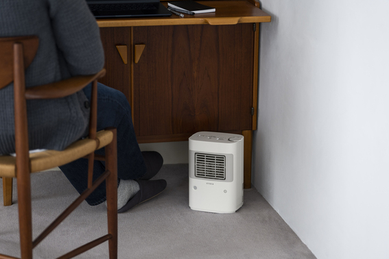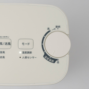 「低(約5℃)」から「高(約30℃)」の範囲で温度を設定できる「温度調節モード」を搭載。本体の周囲の温度が設定温度に達すると運転を止め、設定温度より下がると運転を再開するため、快適な温度を保つことができます。