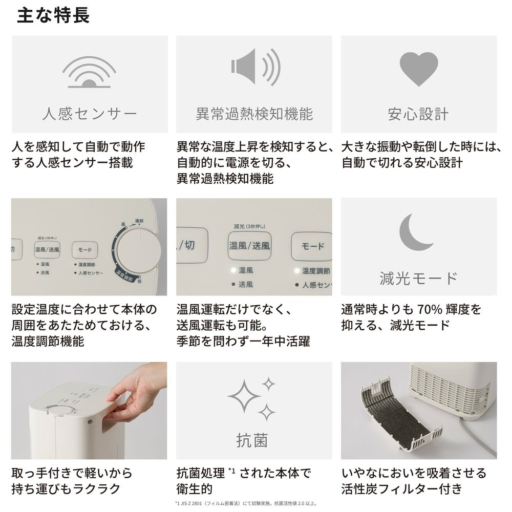 傾きや大きな振動などを検知して自動停止する「転倒・振動検知機能」や、運転中に布などがかかって異常な温度上昇を検知した場合に運転を停止する「異常過熱検知機能」を搭載。安全面にも配慮した設計で、毎日安心してお使いいただけます。