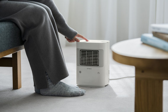 本体前面の人感センサーで人を感知し、自動で運転・停止を切り替え。その場から3分以上離れると自動で運転を停止するため、消し忘れの心配がありません。キッチンやリモートワークのデスク下などで使用の際、一時的にその場を離れる場合の無駄な運転を防ぐため、節電にもつながります。