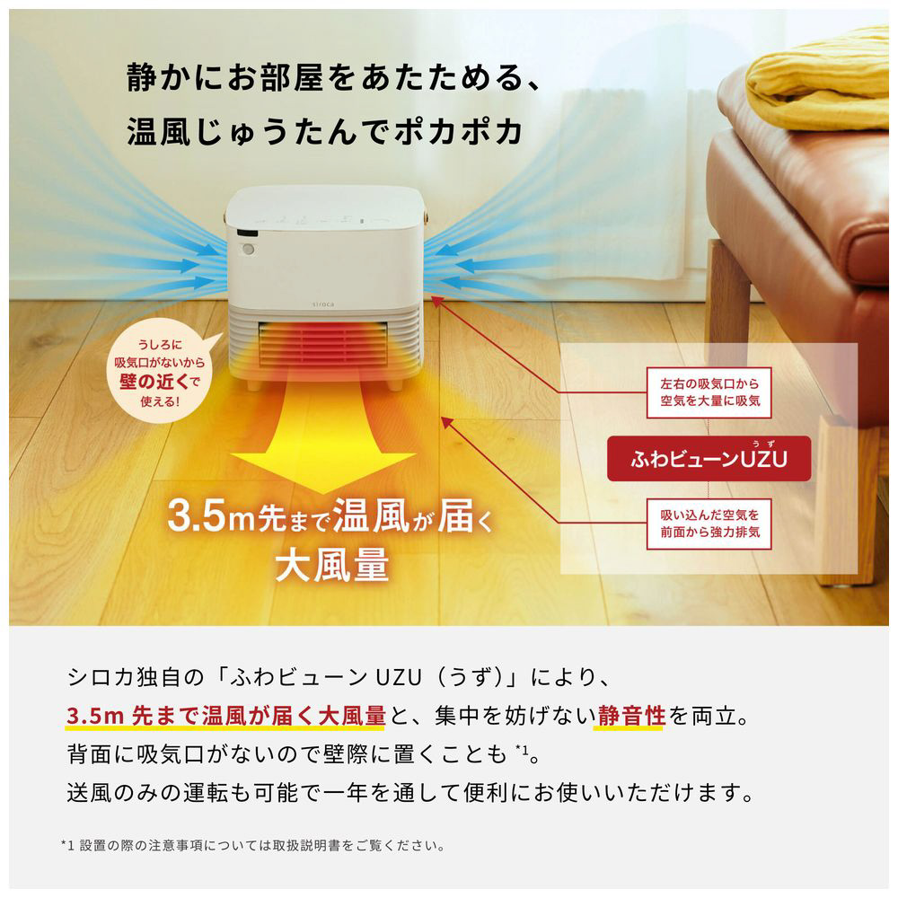 本体左右の吸気口から空気を取り込み、本体前面から送風する「ふわビューンUZU(うず)」により、約3.5m先まで温風が届き、お部屋をあたためます。また、静音性の高さも特長で、温風・弱で運転した場合の運転音は約25dBと、深夜の郊外と同じレベルの静かさ。睡眠時にも稼働音を気にせずお使いいただけます。