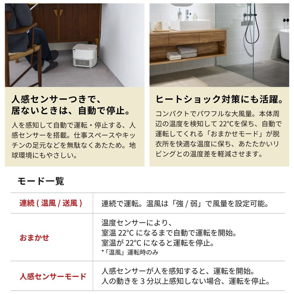 人を感知して自動で運転・停止を切り替える人感センサー付き。その場から離れると自動で運転を停止するため、消し忘れの心配がありません。キッチンや仕事スペースのデスク下などで使用の際、一時的にその場を離れる場合に無駄な運転を防ぐため、節電にもつながります。