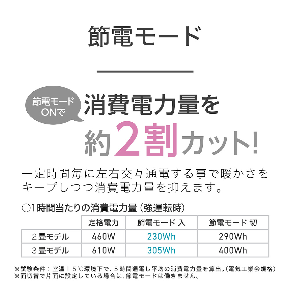 約3分おきに半面ずつ交互に暖まるので消費電力を抑えます。