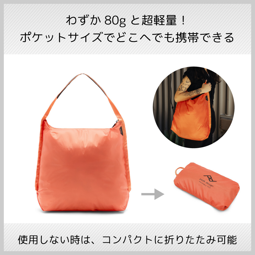 パッカブルタイプのトートバッグ。ポケットに入るほどコンパクトに折りたたむことができます。80gと超軽量で、旅行先でのちょっとした外出時や急に荷物が増えたときなどにサブバッグとして使えます。