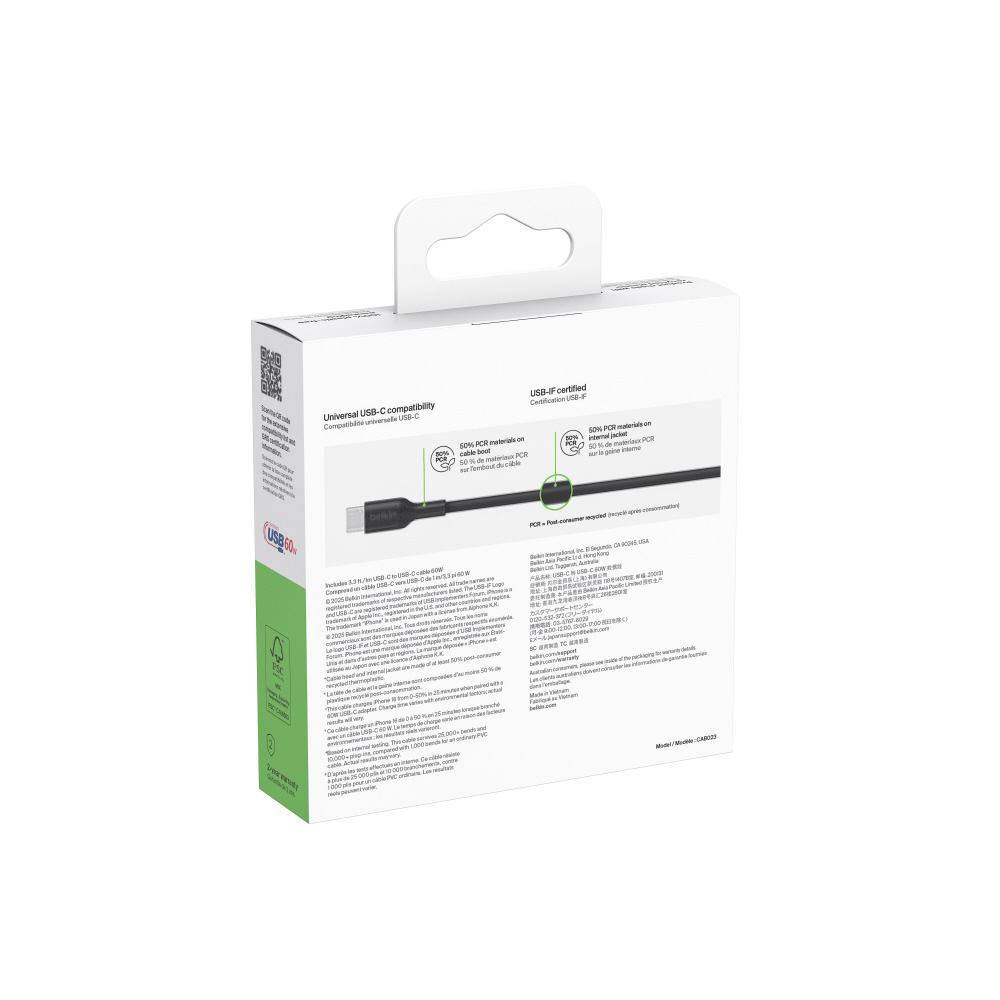 ・外装はPCR PETを95%編み込んでいます。ケーブルブーツ、ストレインリリーフ、ジャケットに50% PCR TPE素材を使用することで、充電性能を損なうことなくプラスチック廃棄物を削減します。