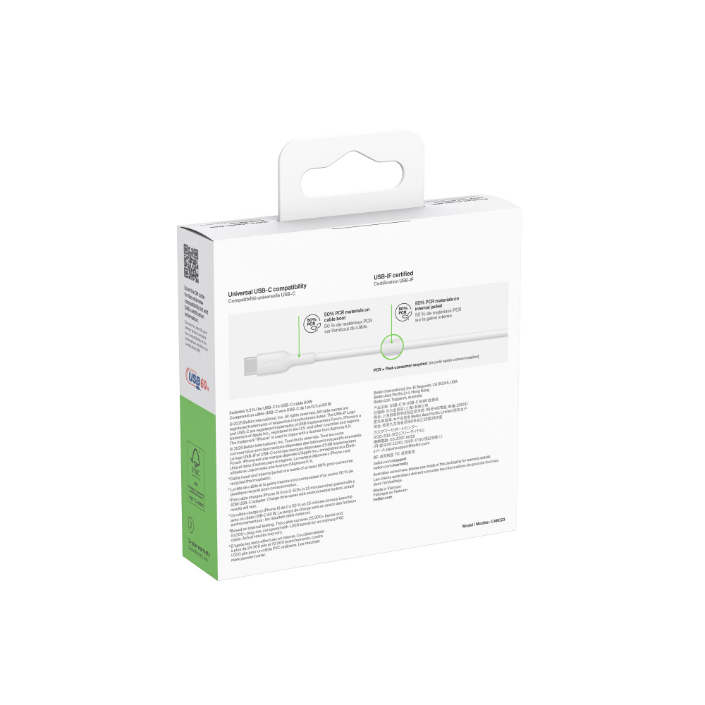 ・外装はPCR PETを95%編み込んでいます。ケーブルブーツ、ストレインリリーフ、ジャケットに50% PCR TPE素材を使用することで、充電性能を損なうことなくプラスチック廃棄物を削減します。