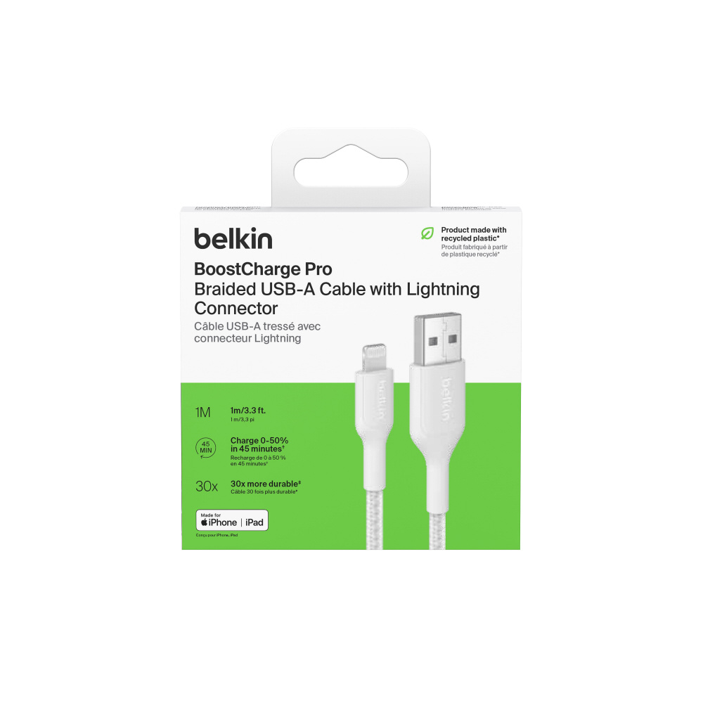 ・30000 回以上の折り曲げと 10000 回以上の抜き差しに耐える Belkin PCR 編組を採用