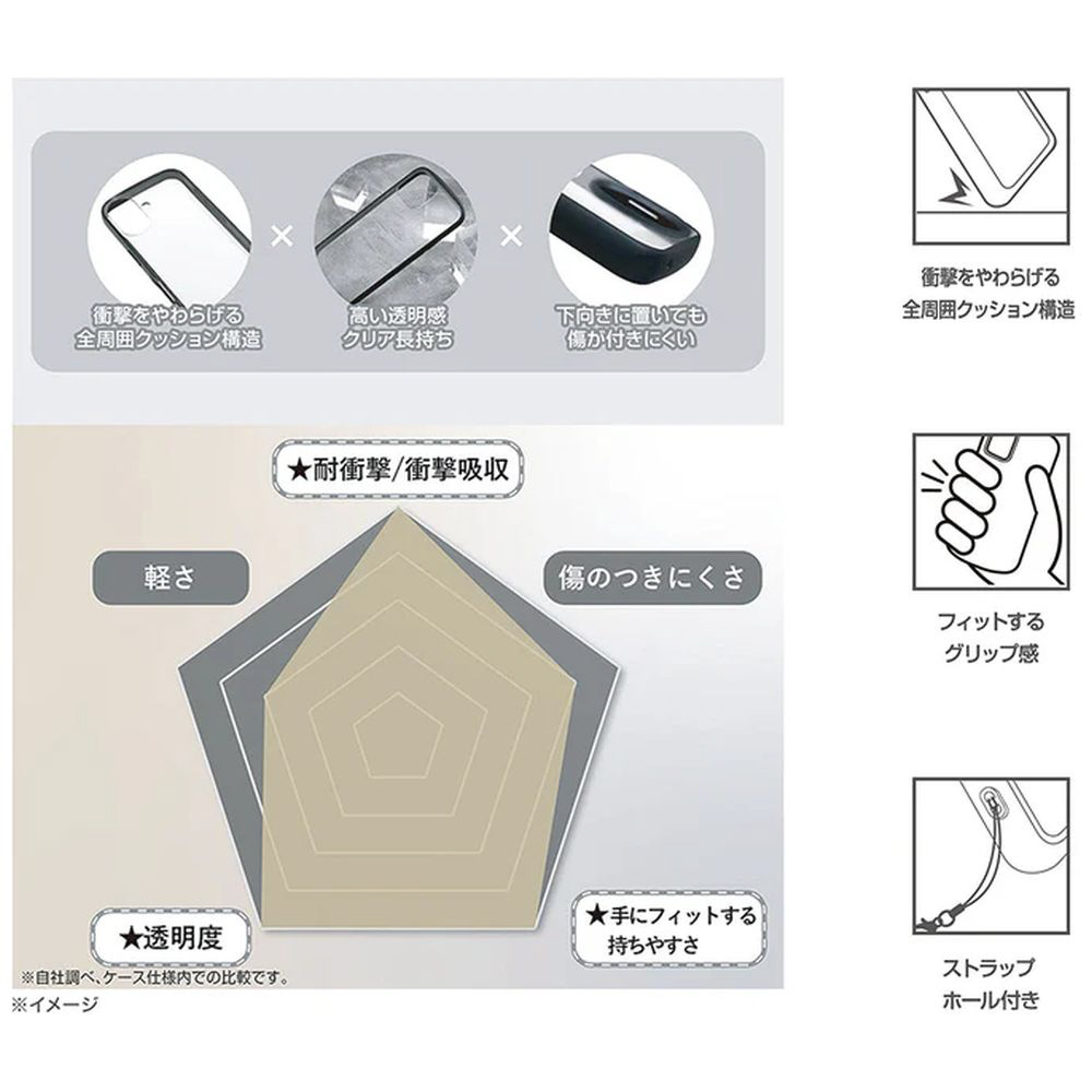 背面は傷に強いポリカーボネート、側面には厚みのあるTPU素材を使用し、安心感のある使い心地を実現しました。