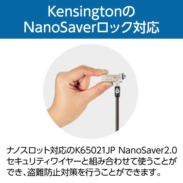 ナノスロット対応のK65021JP NanoSaver2.0セキュリティワイヤーと組み合わせて使うことができ、盗難防止対策を行うことができます。