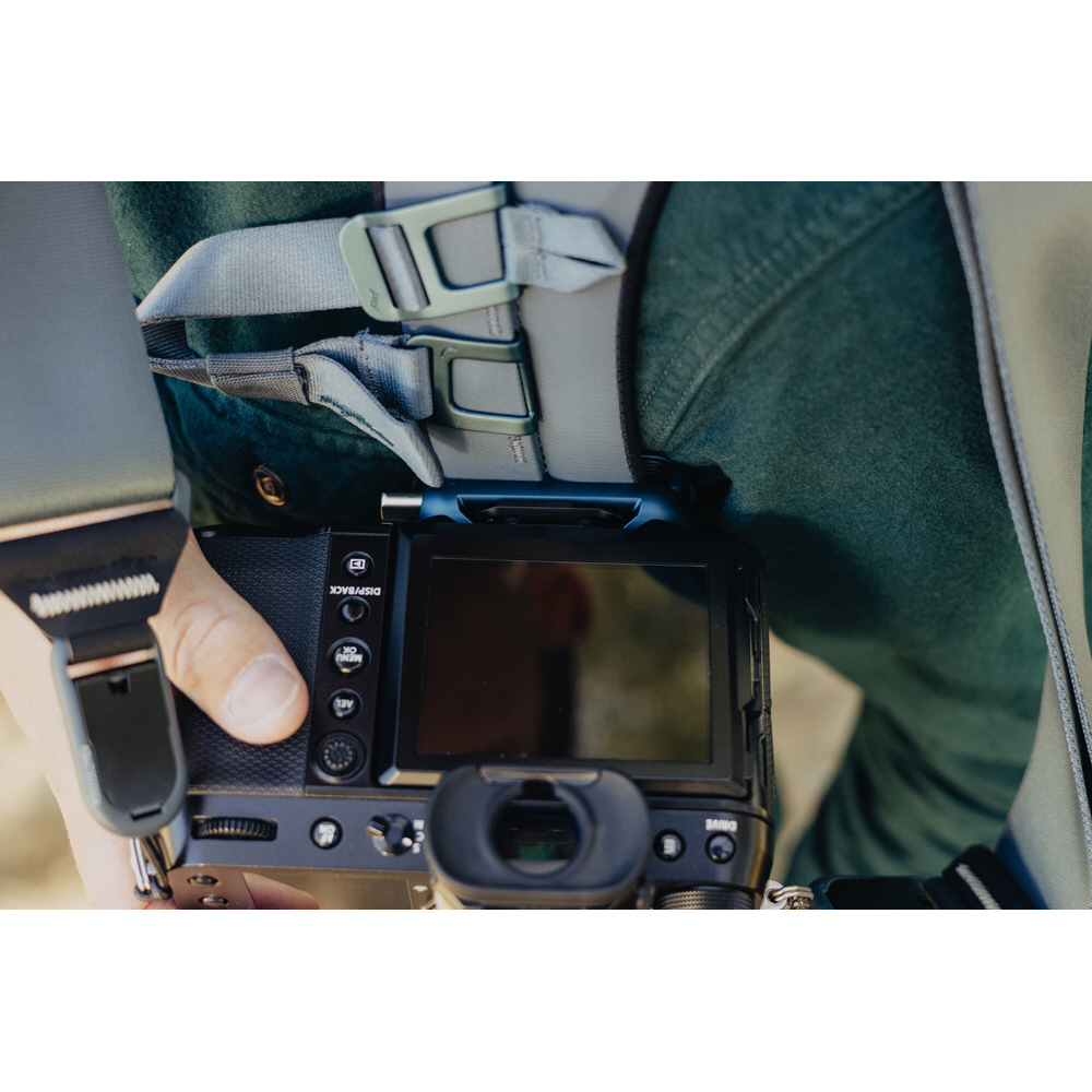 キャプチャーとスタンダードプレートのセット。軽量かつコンパクトながらも確実にカメラをホールドします。シャッ ターチャンスに素早くワンプッシュでカメラを脱着できるクイックリリースプレート機構を持ちます。