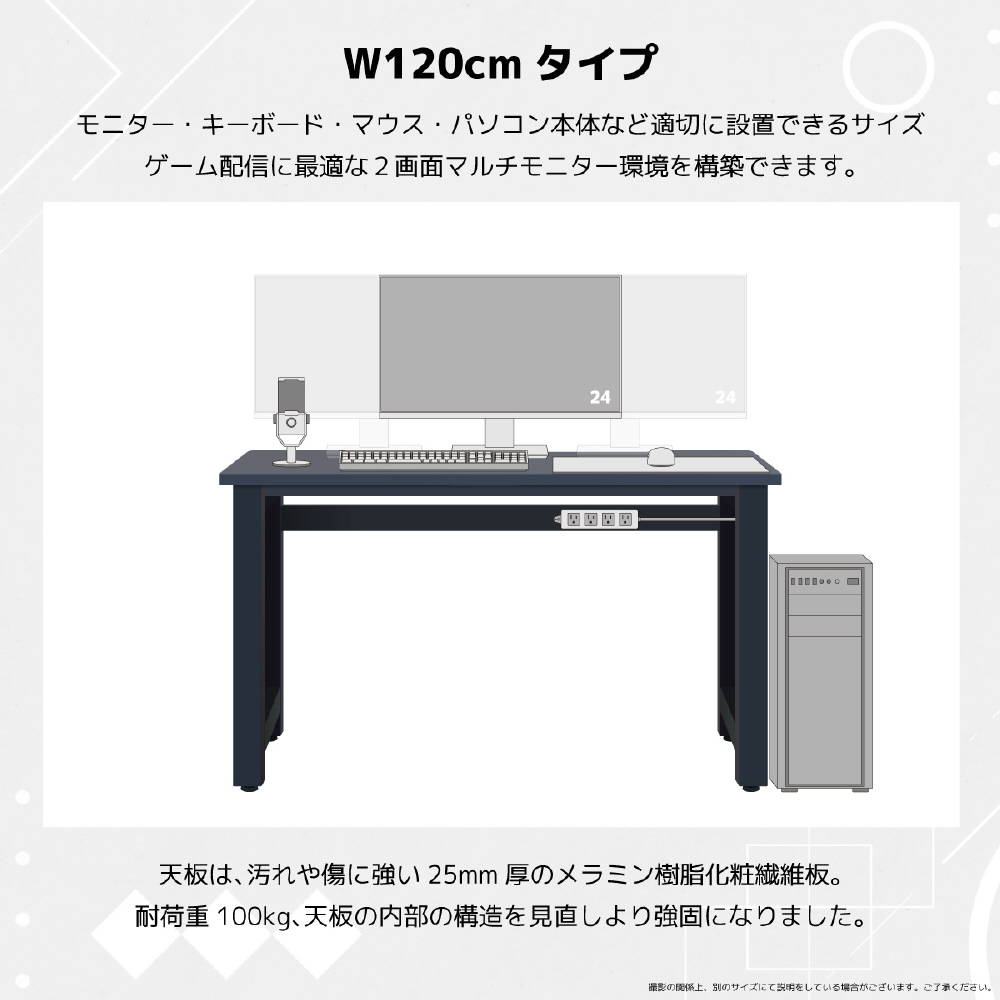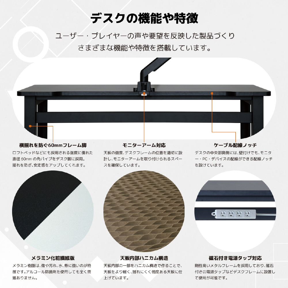 デスク奥側やサイドなどモニターアームやクランプでマイクなど取り付けることができるように設計。