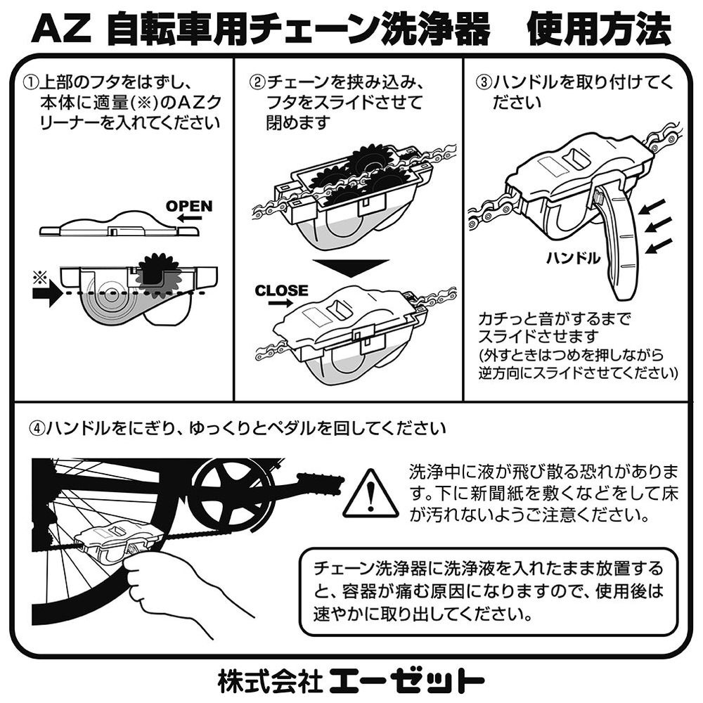 洗浄液をいれて、チェーンを挟んで、まわすだけで、自転車チェーンの洗浄がらくらく行えます。