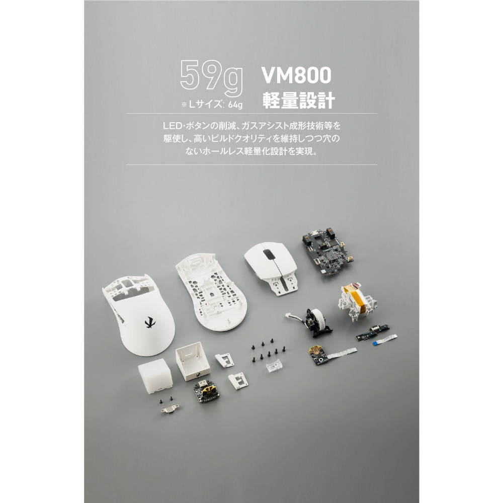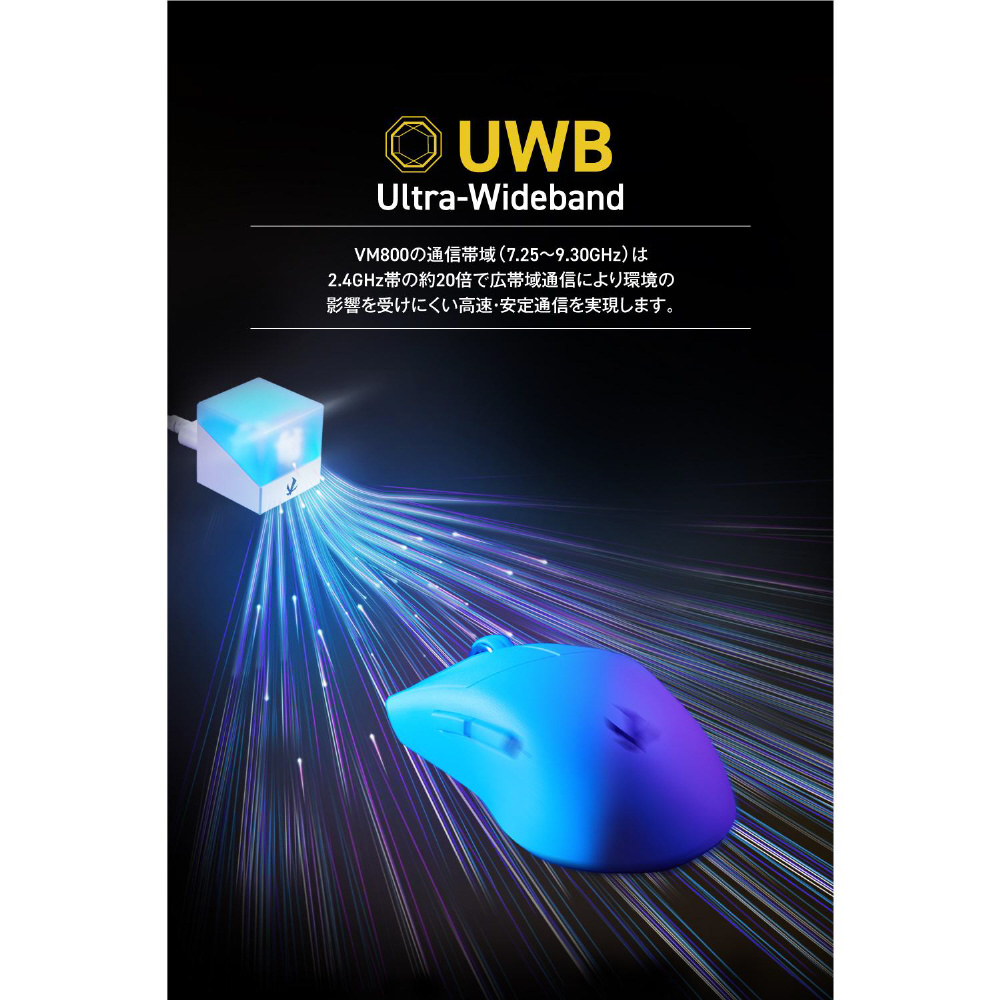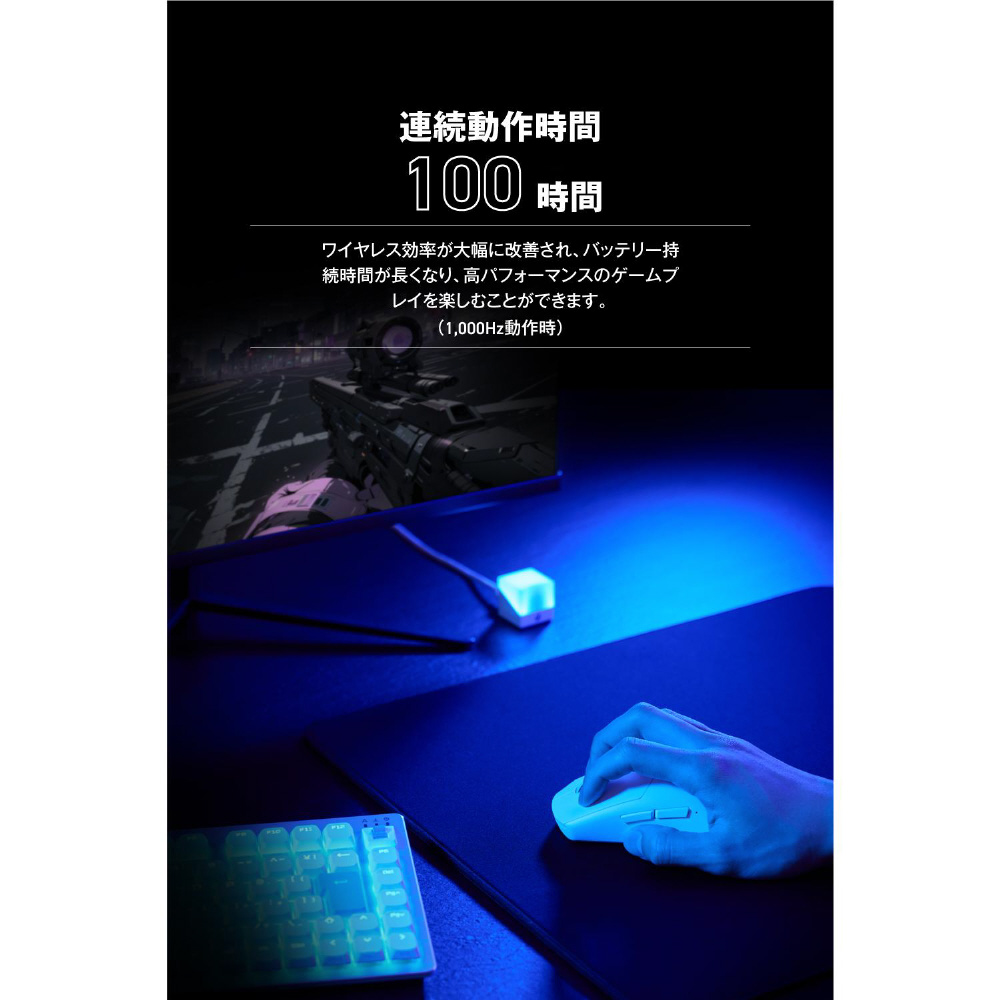 「かぶせ持ち」「つかみ持ち」に最適化されたハーフエルゴ形状を採用し、8Kポーリングレート対応とUWB無線通信の組み合わせにより、遅延が少なく安定した通信環境でのゲームプレイが可能です。マウス操作を安定させる形状と軽さにこだわり、キレのあるエイムを生み出す設計を実現。右利きに最適化された左右非対称形状のガンシューティング系ゲーム(FPS)向け軽量ゲーミングマウスです。