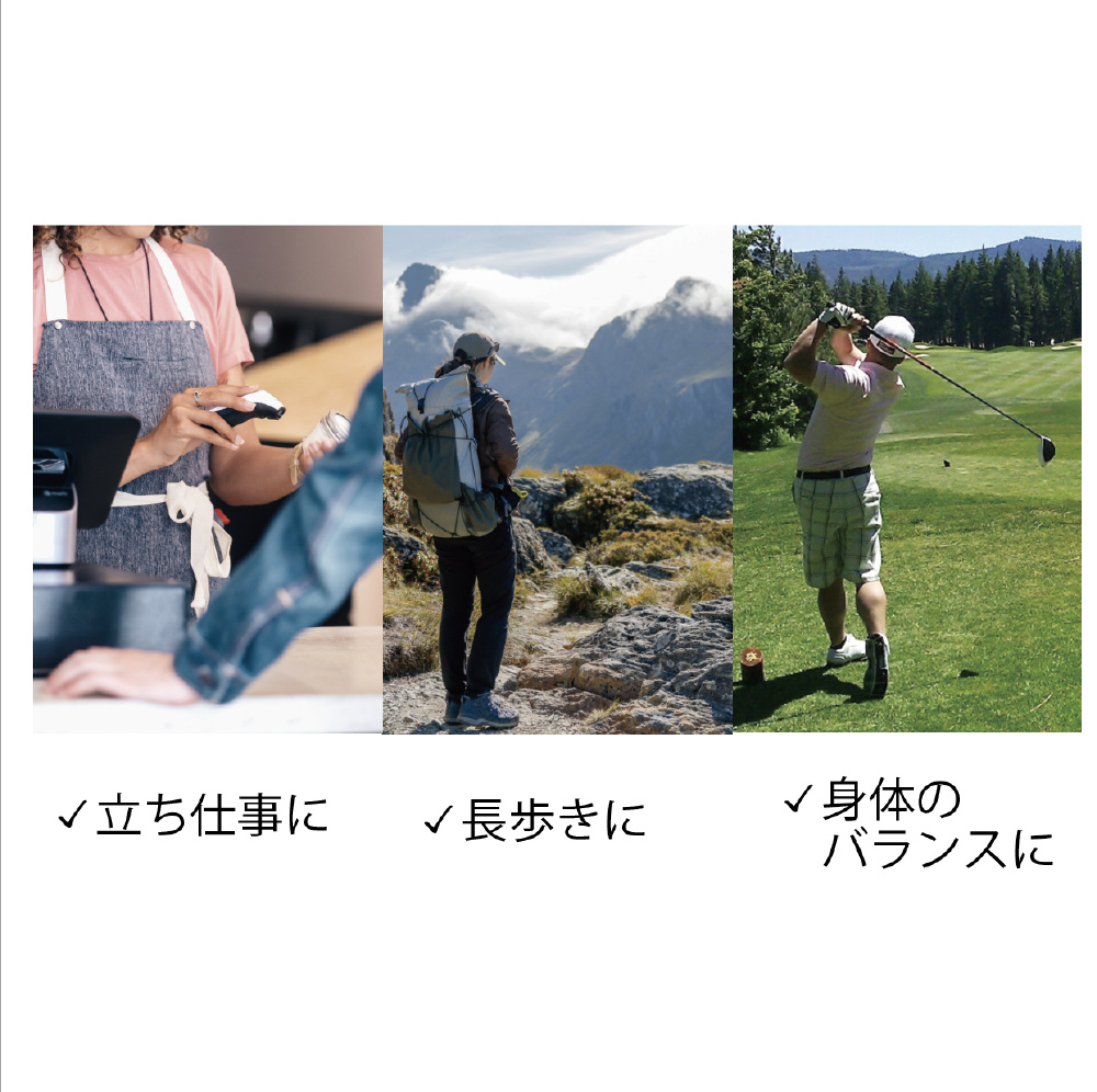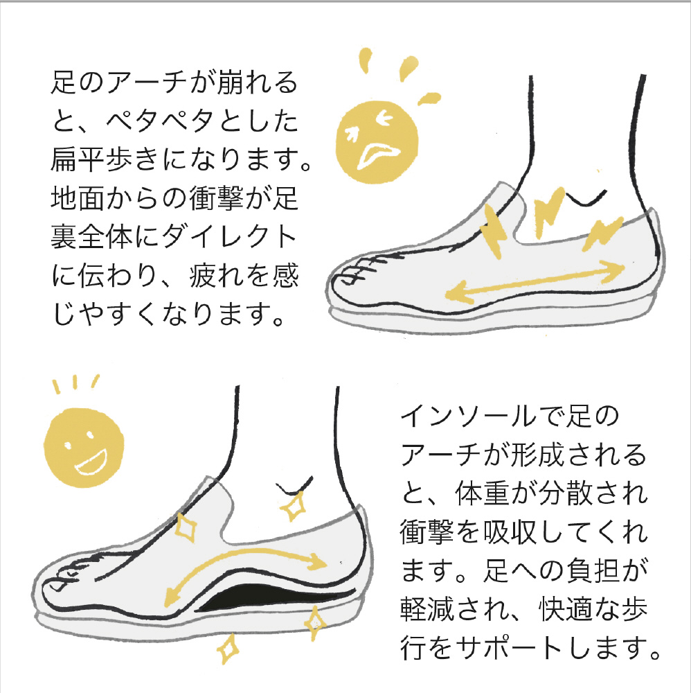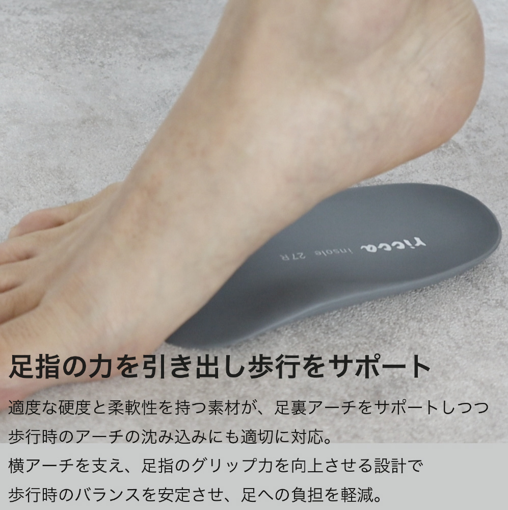 横アーチを支え、足指のグリップ力を向上させる設計で、歩行時のバランスを安定させ、足への負担を軽減。