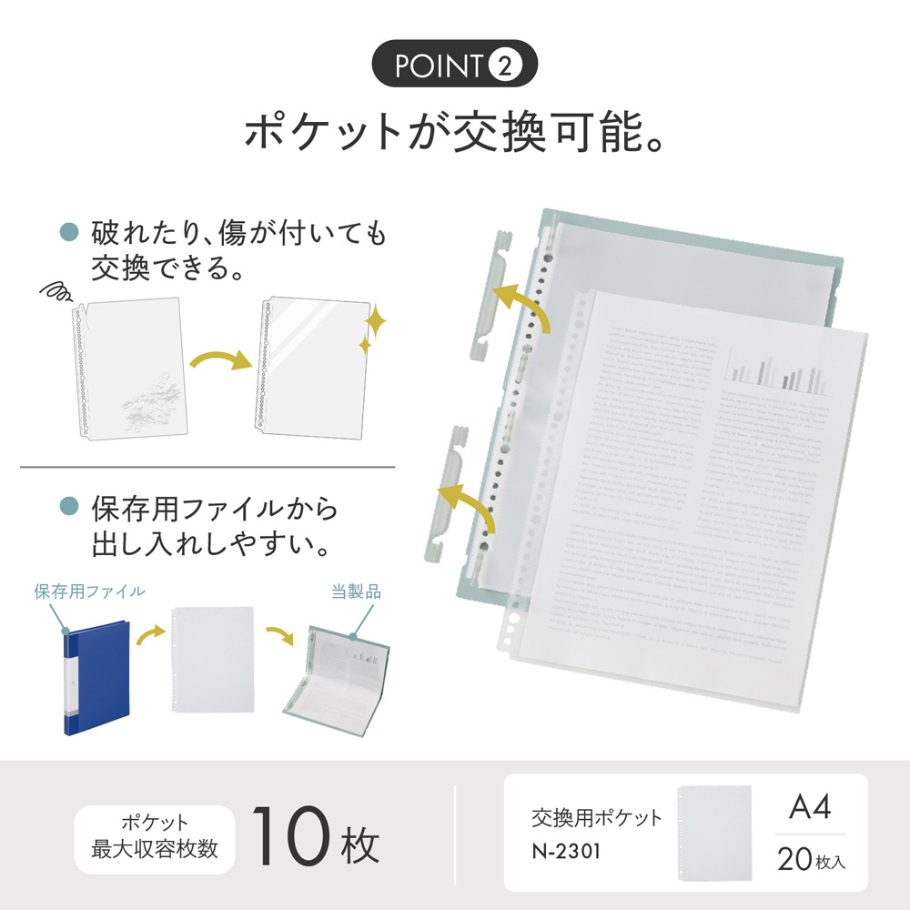 ポケットの抜き差しが可能なポケット交換式なので、保存用ファイルとの入れ替えも簡単。