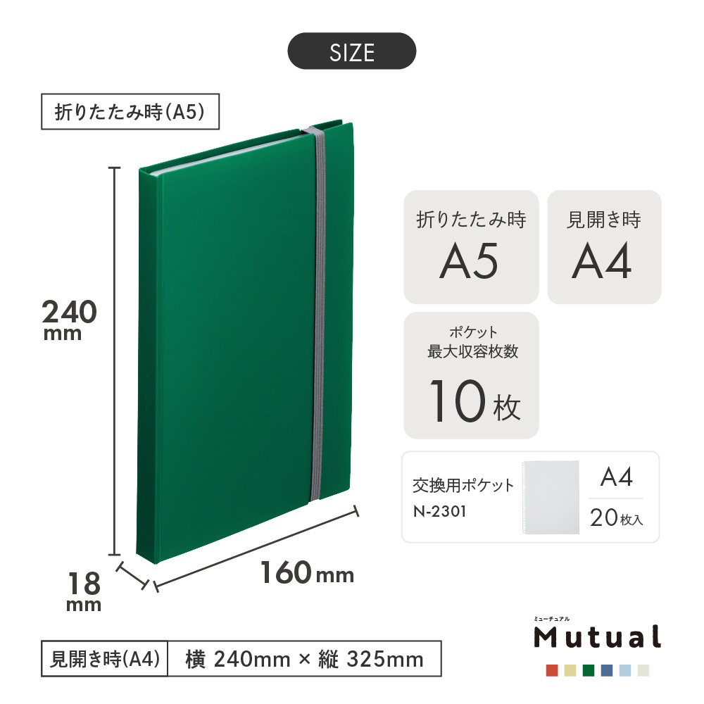 | 商品名 | Mutual 二つ折りクリヤーブック<ポケット交換式> A5(A4・2ツ折) ディープグリーン N2421-7 |