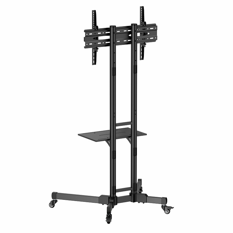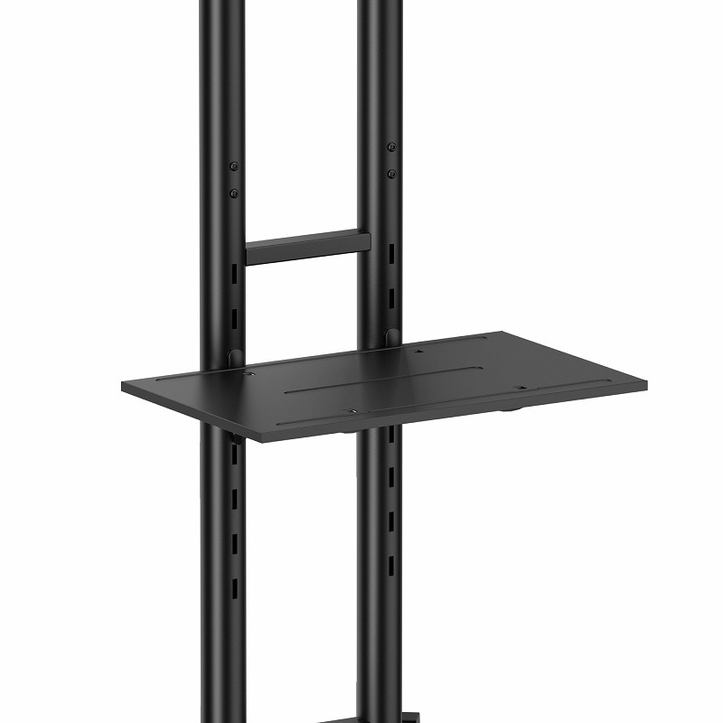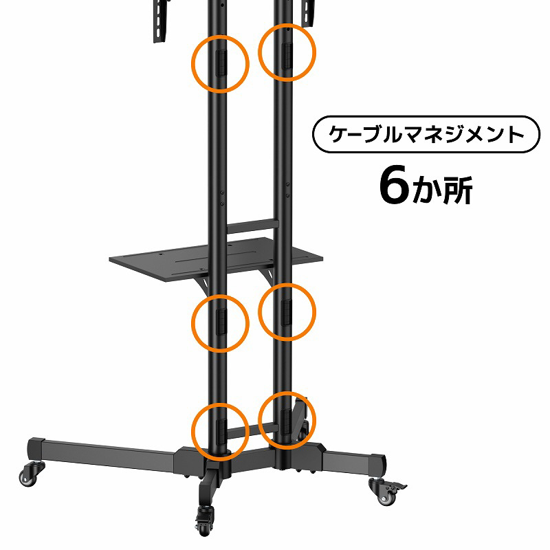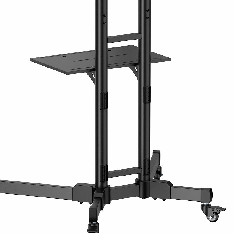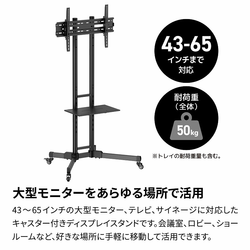 43〜65インチの大型モニター、テレビ、サイネージに対応したキャスター付きディスプレイスタンドです。