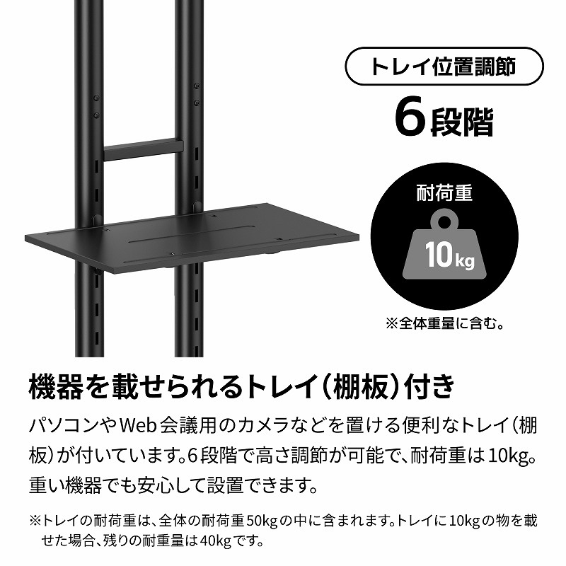 ※トレイの耐荷重は、全体の耐荷重50kgの中に含まれます。トレイに10kgの物を載せた場合、残りの耐重量は40kgです。