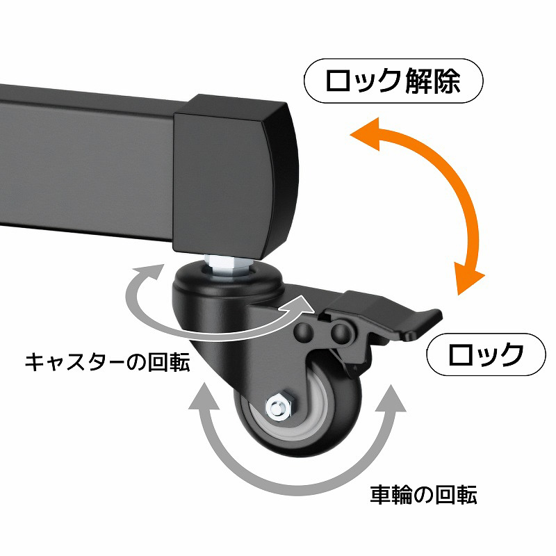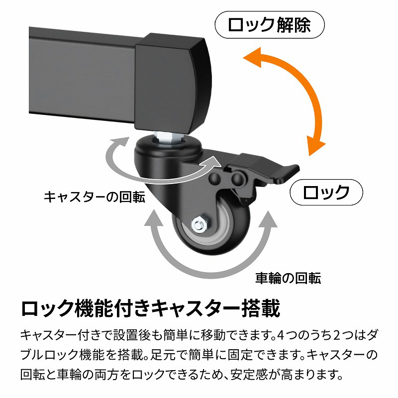 キャスターの回転と車輪の両方をロックできるため、安定感が高まります。