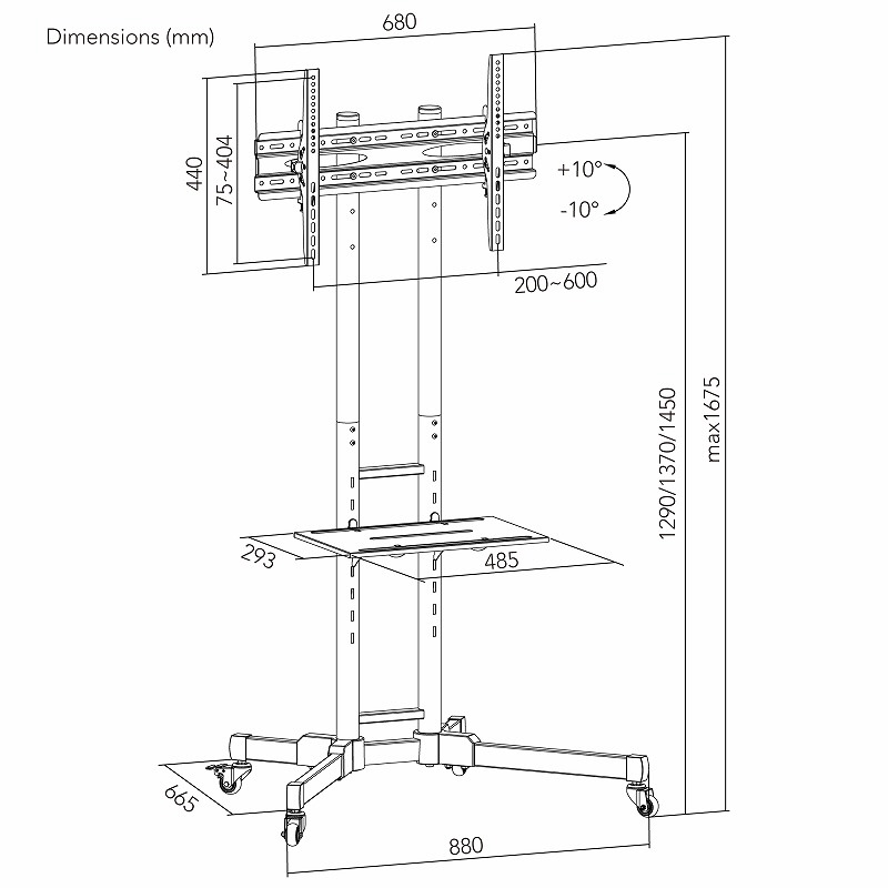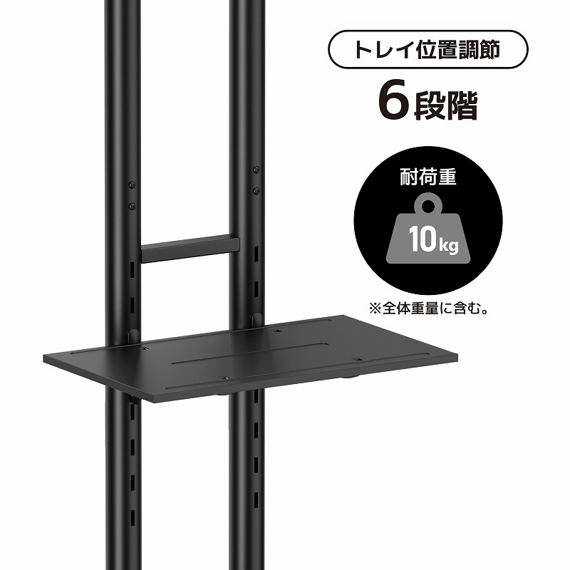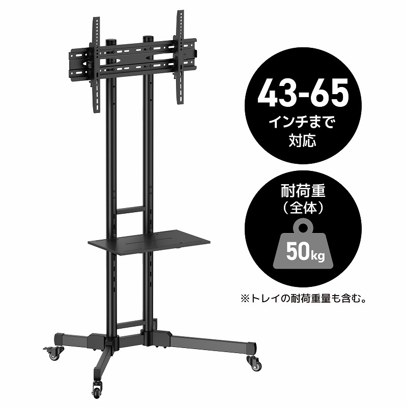 | 仕様1 | [対応モニターサイズ] 43〜65インチまで [対応規格]VESA 200x200 / 400x200 / 300x300 / 400x400 / 600x400 [耐荷重]全体:最大50kgまで、トレイ:最大10kgまで(全体重量に含む) ※トレイの耐荷重は、全体の耐荷重50kgの中に含まれます。トレイに10kgの物を載せた場合、残りの耐重量は40kgです。 [チルト]+10° / -10°(上下) [モニター高さ調節]3段階 [トレイ位置調節]6段階 |