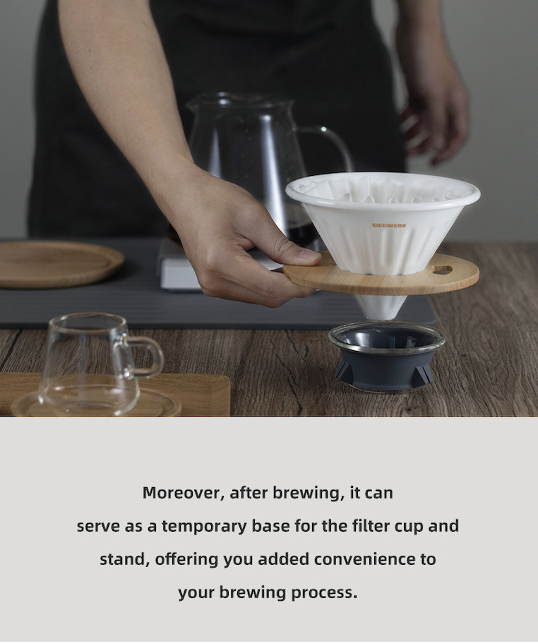 また、抽出後はドリッパーとドリッパーホルダーを置くための一時的なベースとしても使え、抽出プロセスをさらに便利にします。