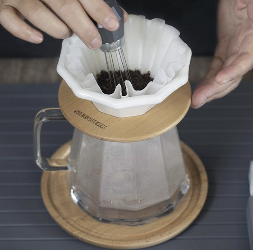 細い針でコーヒの粉を損拌して静竜気などで発生したダマ(粉の塊)が溜まるのを抑え密度を整えるバリスタツールです。
