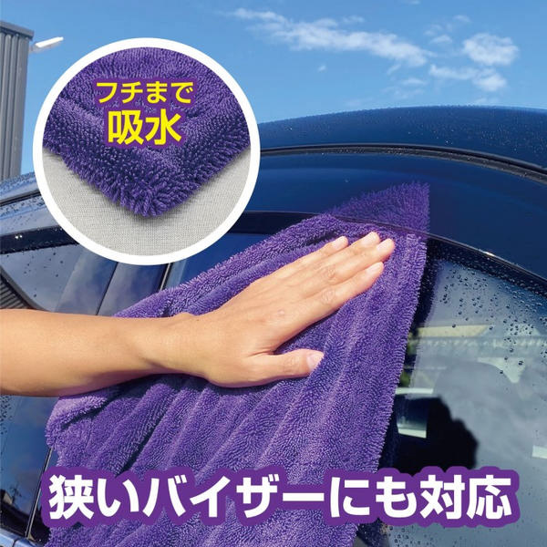 極厚両面ツイストマイクロファイバー仕様の、洗車後の水滴拭き上げに最適な吸水用クロスです。