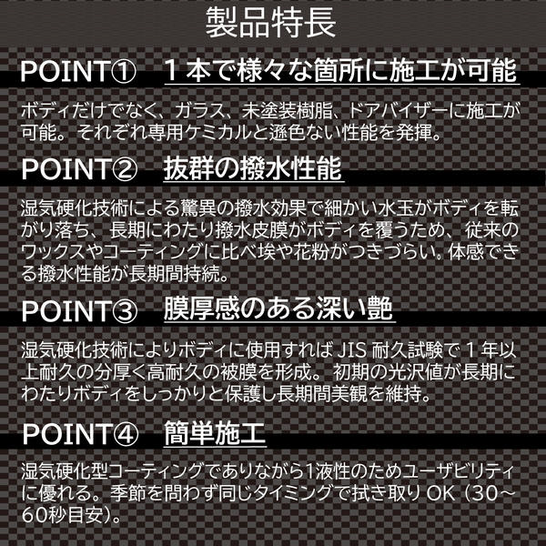 性能を発揮し本製品1本で愛車の外装を保護することが可能です。