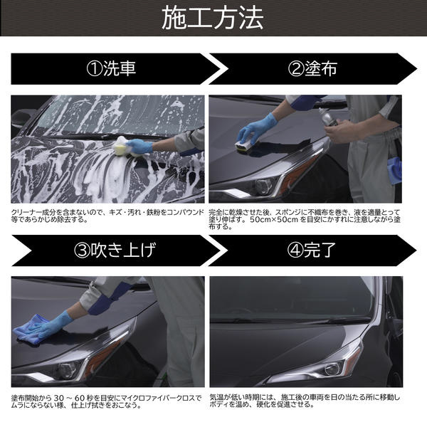 硬化型コーティング剤でありながら「(1)塗布 → (2)30〜60秒乾燥 →(3)拭き上げ」 という3ステップで