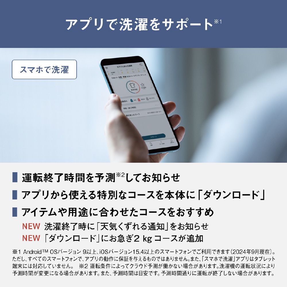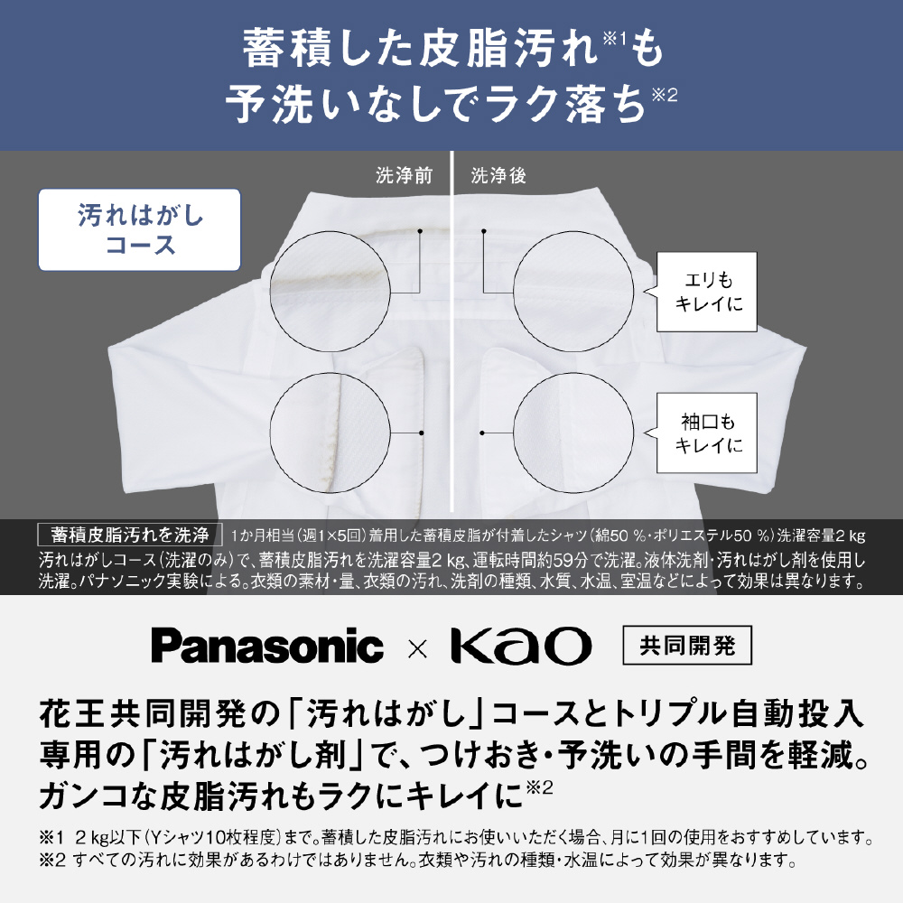 ・花王共同開発の「汚れはがしコース」でつけおき・予洗いの手間を軽減します。