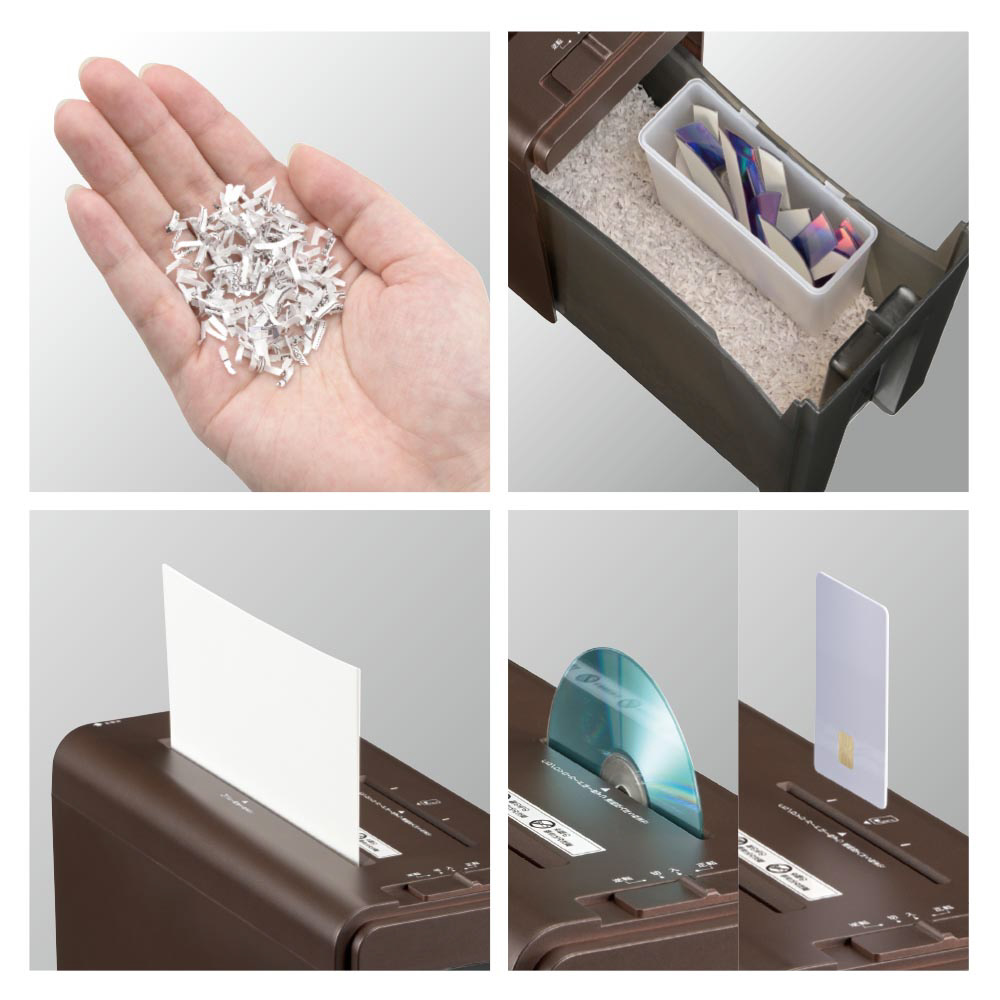 ■ 最大細断枚数:紙…A4コピー用紙(64g/m2)5枚、CD/DVD・カード…1枚