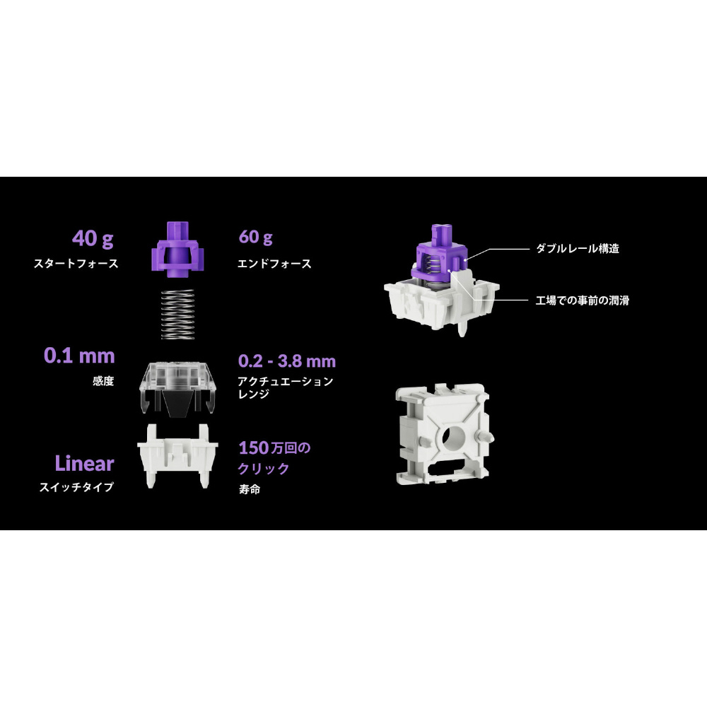 わずか0.1mmの感度を持つ最適な磁気センサーを搭載し、より貴重なフィードバックを提供します。アクチュエーションポイントをカスタマイズし、パーソナライズされた移動深度に基づいて1つのキーに複数のアクションを割り当てることで、ゲームプレイを向上させ、カスタマイズされたタイピング感覚を提供します。