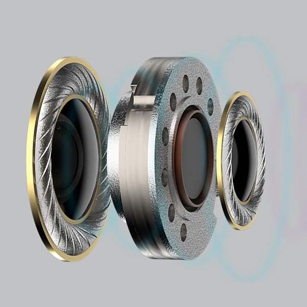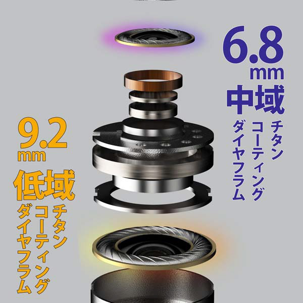 低域には9.2mmチタンコーティングコンポジットダイヤフラムを採用し、深く沈み込む低域と、サウンドの弾力と力強さが緻密に制御されたバランスを追求し、中域には、一回り小さい6.8mmチタンコーティングコンポジットダイヤフラムを採用することで、ボーカルと楽器隊のサウンドが鮮明に響き渡り、ピュアで澄み切ったサウンドでまるで目の前にステージが広がるかのようなリスニング体験を実現。