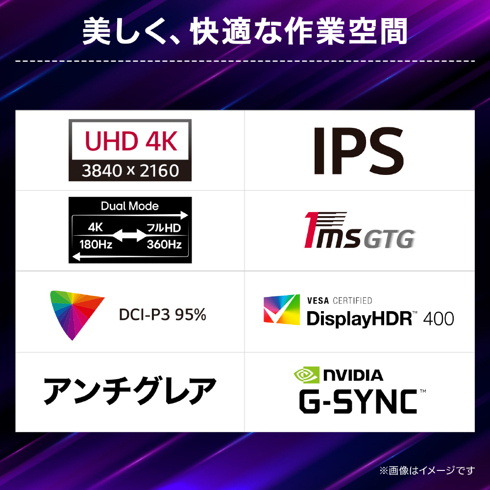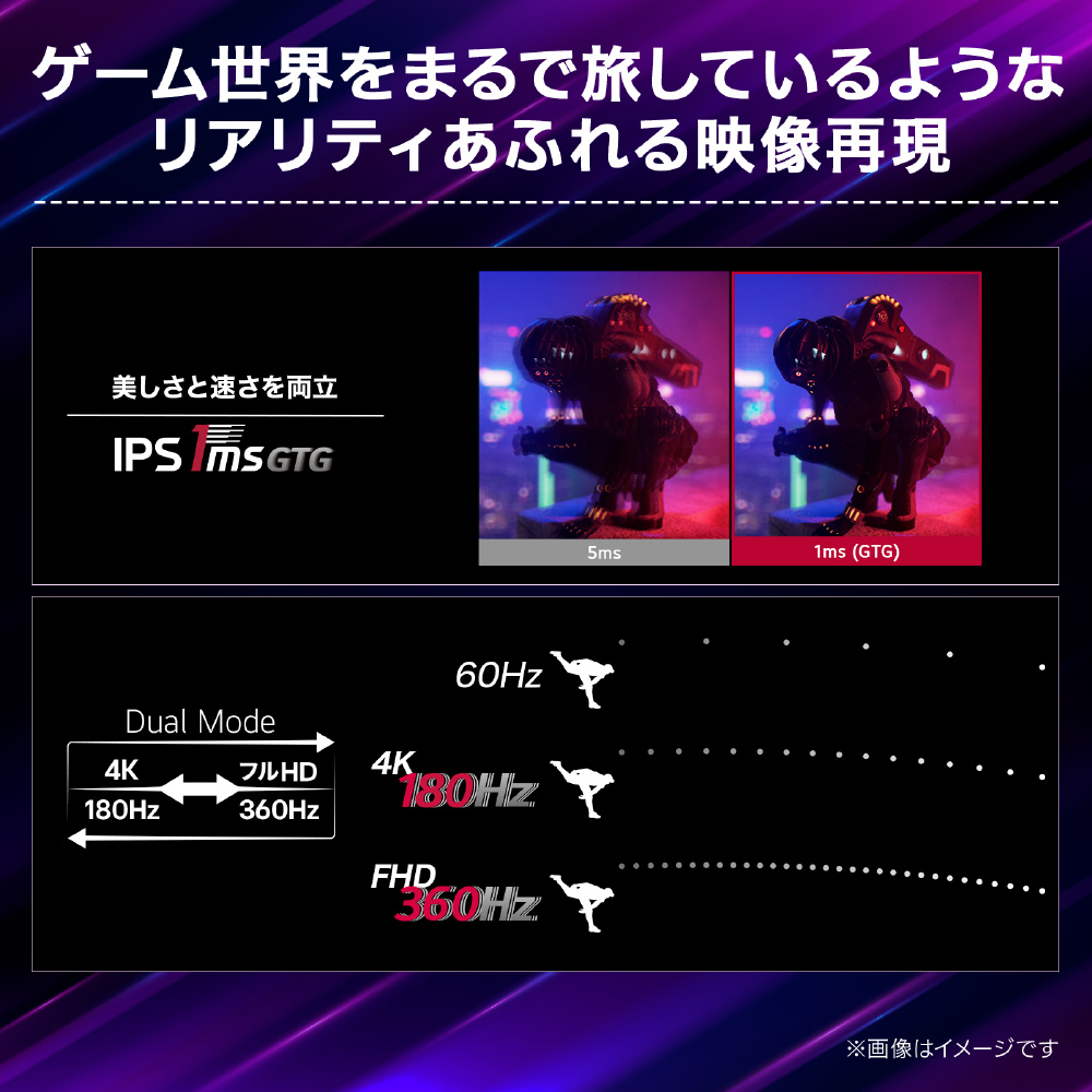 VESA Dual Modeに対応。4K@180HzとフルHD@360Hzの両方が使用可能。FPSなど一目で表示全体を見渡したいゲームにも、RPGなど美しい世界観を壮大かつ美麗な表示で、あらゆるゲームを楽しめます。