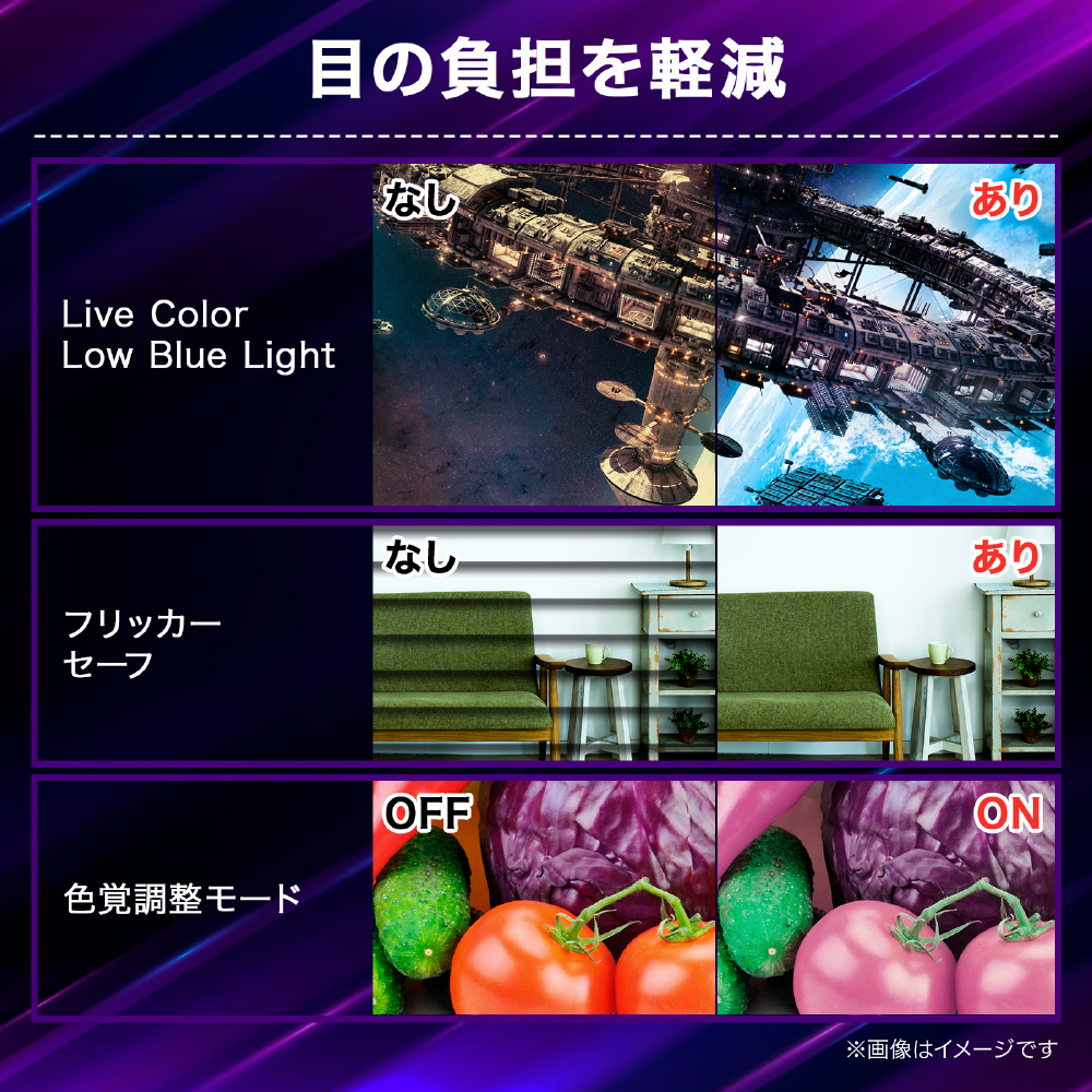 従来のピクチャーモードで設定していた「ブルーライト低減モード」は、紙に近い色温度で表示させることで、ブルーライトを抑えた表示にするため、本来の色合いとは異なる表示になっていました。Live Color Low Blue Lightは、通常の表示で、正確な色を極限まで維持しながらブルーライトを抑えます。