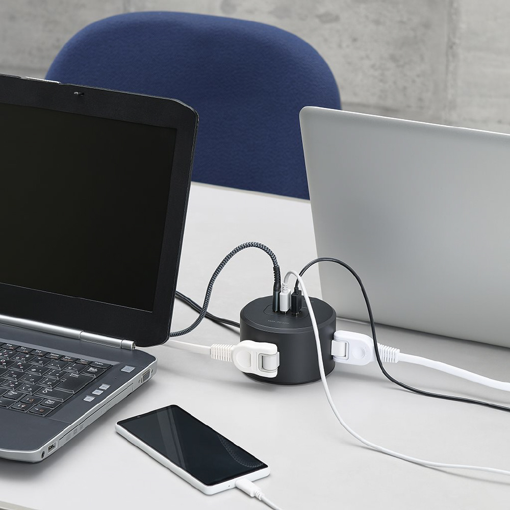 USB充電しながらコンセントも使える 丸型タップ4個口PD20W0.5m 黒