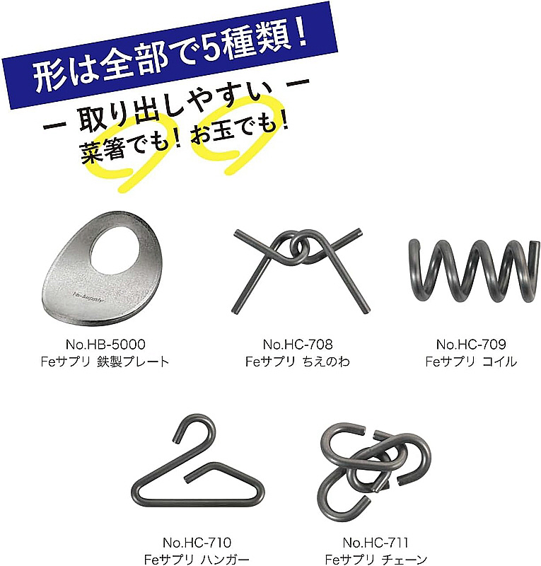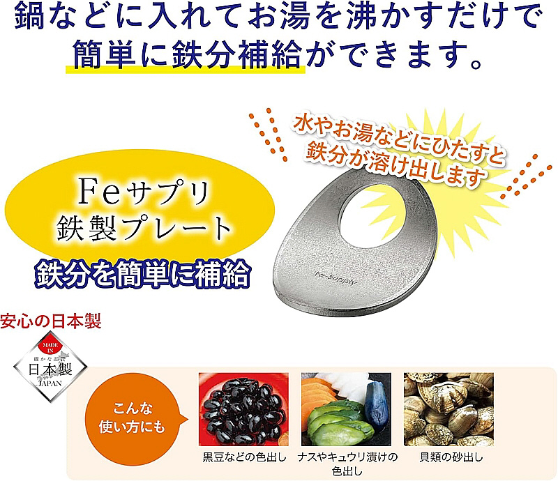 鉄分を簡単に補給。水やお湯などにひたすと鉄分が溶けだします。ナスやキュウリ漬けの色だしや貝類の砂出しに。鍋ややかん等でお湯を沸かす際に使用するものです。電気ポット・炊飯器等の電気機器で使用しないでください。電気機器の破損や故障の原因となります。錆が発生した時は、スチールたわし等でこすり落としてください。