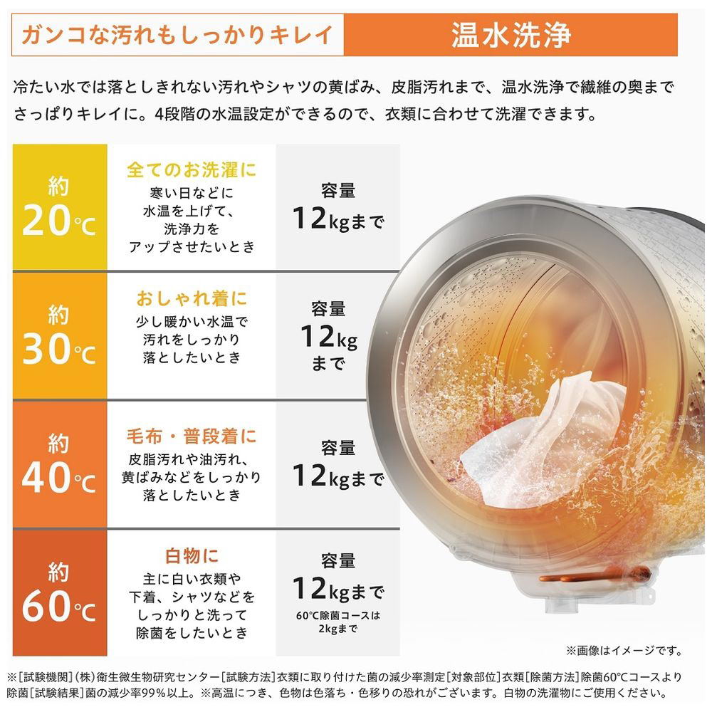 ・衣類の汚れに合わせ、20/30/40/60℃の4段階に水温設定ができます。