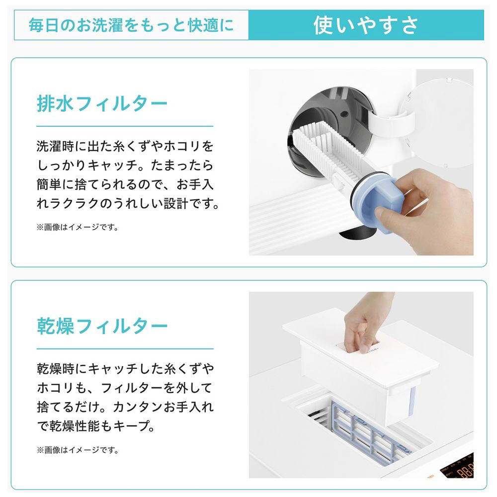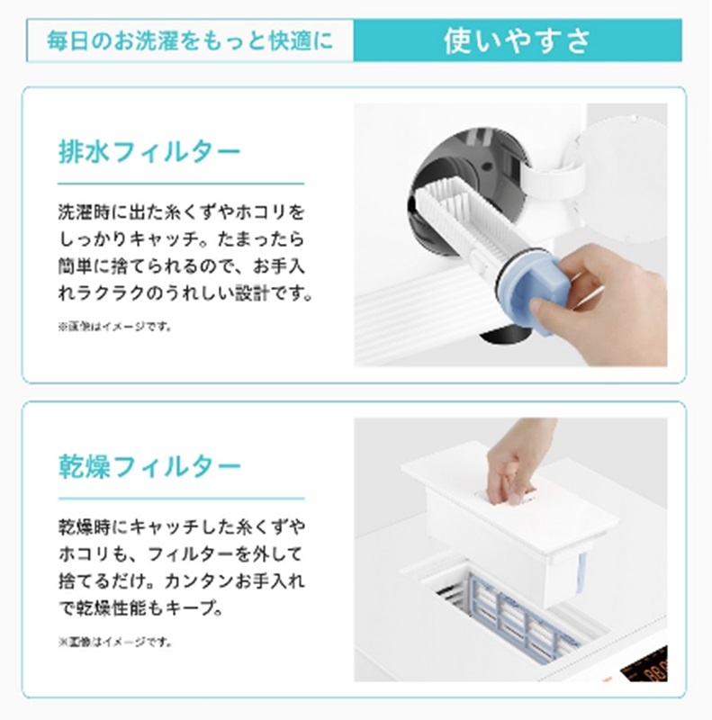 ・排水フィルターと乾燥フィルターの糸くずやホコリを簡単に捨てられ、お手入れラクラク。