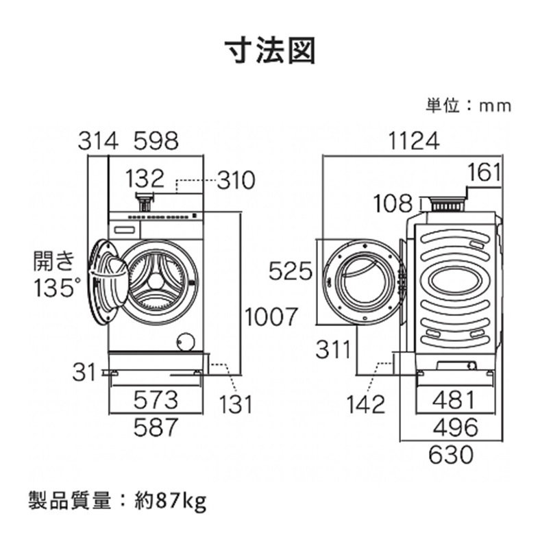 | 本体サイズ(幅×高さ×奥行)mm | 598×1007×630 |