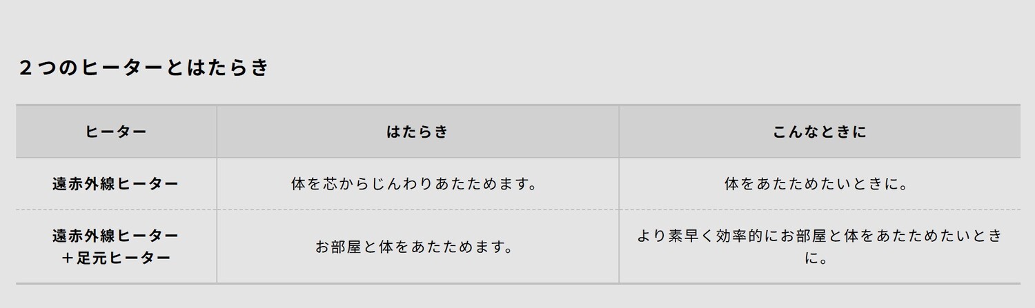 | 仕様1 | 《足元ヒーター×遠赤外線ヒーター》ダブルの熱源で足元すばやく&体の芯からポカポカ |