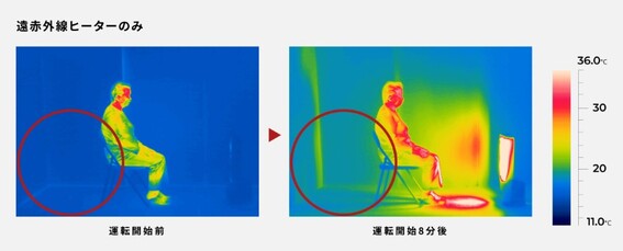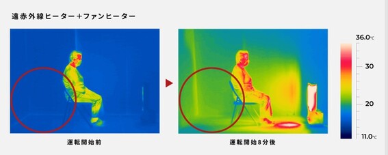 * 遠赤外線ヒーター+ファンヒーター(遠赤外線ヒーター800W+PTCヒーター250W(弱))と、遠赤外線ヒーターのみ(遠赤外線ヒーター1000W+PTCヒーターOFF)で比較。