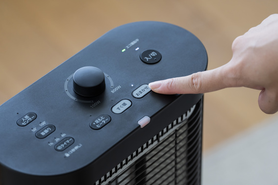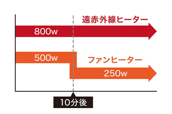 10 分経過すると足元ヒーター(ファンヒーター)はワット数を自動的に下げて省エネ運転に切り替えます。