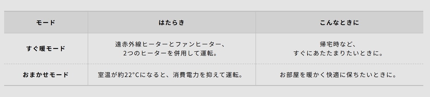帰宅時などすぐにあたたまりたいときに便利な「すぐ暖」、22℃を基準に自動で快適な温度を保つ「おまかせ」の2つのモードを搭載。直感的にモードを選ぶことができる、操作性の高さも特長です。