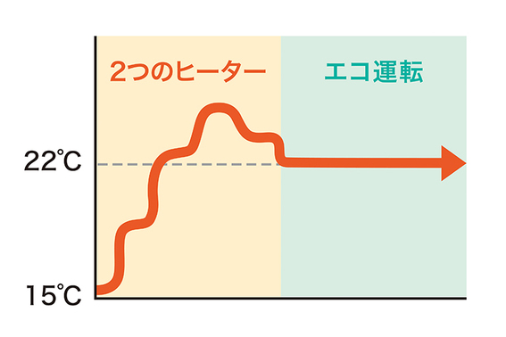 22°Cを基準に、2つのヒーターを自動で組み合わせて最適に運転します。