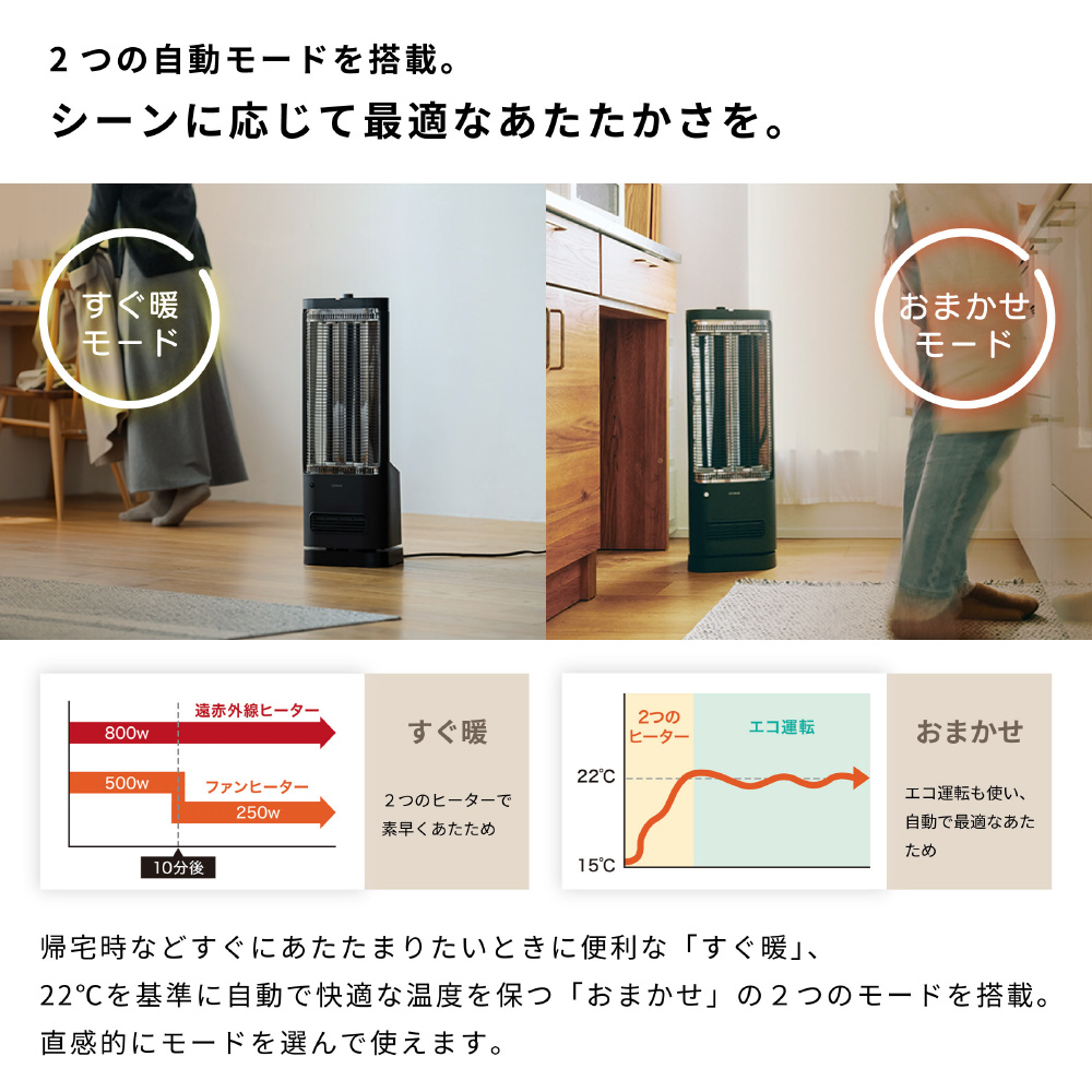 帰宅時などすぐにあたたまりたいときに便利な「すぐ暖」、22℃を基準に自動で快適な温度を保つ「おまかせ」の2つのモードを搭載。直感的にモードを選ぶことができる、操作性の高さも特長です。