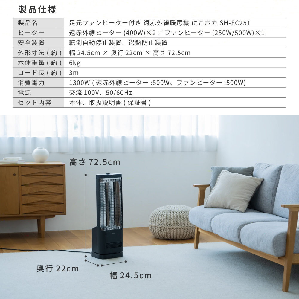 | 商品名 | 足元ファンヒーター付き 遠赤外線暖房機 にこポカ siroca ホワイト SH-FC251W [石英管ヒーター /人感センサー付き] |